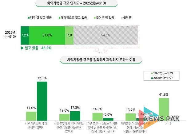 가맹본부의 53%가 차액가맹금이 존재한다고 응답했으며, 평균 금액은 연간 224만 원으로 조사됐다. 가맹점주를 대상으로 한 조사에서 차액가맹금의 규모를 알고 있는 응답자는 45.2%에 불과했으며, 정확하게 파악하지 못하는 이유에 대해 차액가맹금에 대한 무관심이 72.1%로 가장 높게 나타났다.