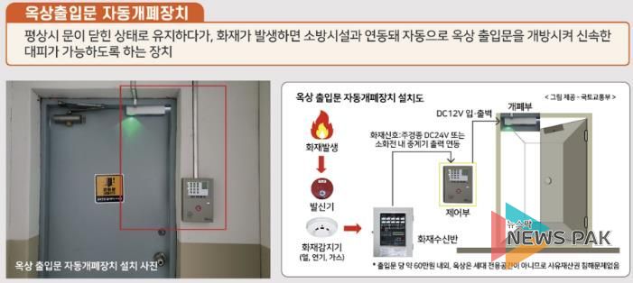 옥상 출입문 비상 자동개폐장치는 평소 문이 닫힌 상태에서 화재가 발생했을 경우 소방시설과 연동돼 자동으로 옥상 출입문을 개방해 신속한 대피를 돕는다.