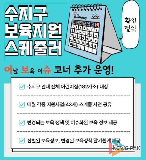 뉴스팍 배상미 기자 | 용인특례시 수지구는 보육 정책 등을 알기 쉽게 정리한 ‘보육지원 스케줄러’에 이달 보육 이슈 항목을 신설했다고 15일 밝혔다.