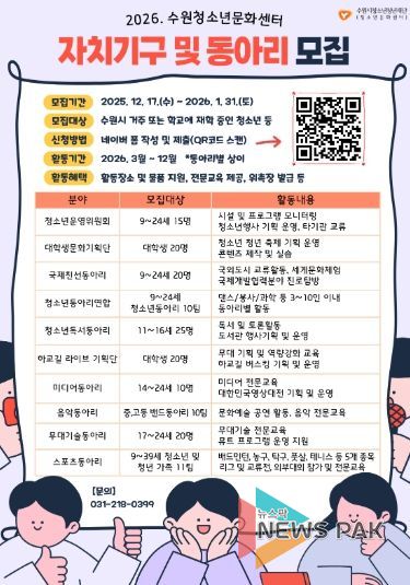 뉴스팍 배상미 기자 | 수원시청소년청년재단 수원청소년문화센터는 청소년의 자치 역량 강화와 문화 활동 참여 확대를 위해 '2026년 수원청소년문화센터 자치기구 및 동아리' 단원을 모집한다.