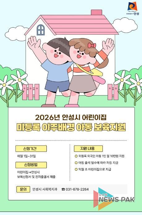 뉴스팍 배상미 기자 | 안성시는 2026년부터 어린이집에 다니는 미등록 외국인(이주배경) 영유아에게 월 10만원의 보육지원금을 지원한다고 밝혔다.