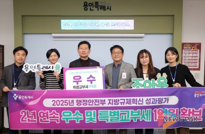 뉴스팍 배상미 기자 | 용인특례시는 지난해에 이어 ‘지방규제혁신 성과평가’에서 우수 기관으로 선정돼 특별교부세 1억 원을 확보했다고 16일 밝혔다.