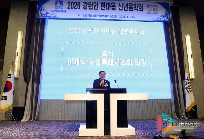 뉴스팍 배상미 기자 | 수원특례시의회는 1월 16일수원컨벤션센터에서 열린 '2026 강원인 한마음 신년음악회'에 참석했다. 이번 행사는 수원특례시 강원특별자치도민회가 주최한 신년 행사로, 이재식 의장을 비롯한 내빈과 강원 출신 시민 등 약 250여 명이 참석한 가운데 신년음악회, 표창 수여, 만찬 등의 순서로 진행됐다.