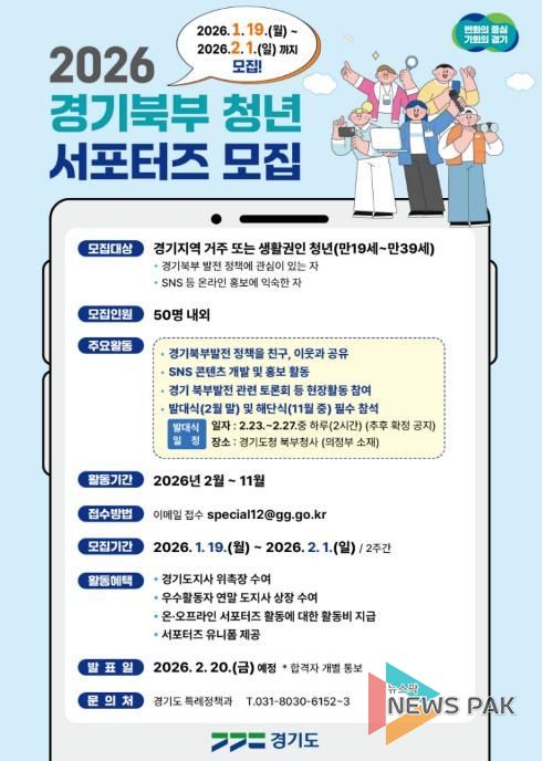 뉴스팍 배상미 기자 | 경기도는 경기북부 발전에 대한 도민 인식을 높이고 그 필요성을 홍보하기 위해 1월 19일부터 2월 1일까지 ‘경기북부 청년 서포터즈 2기’를 공개모집한다.