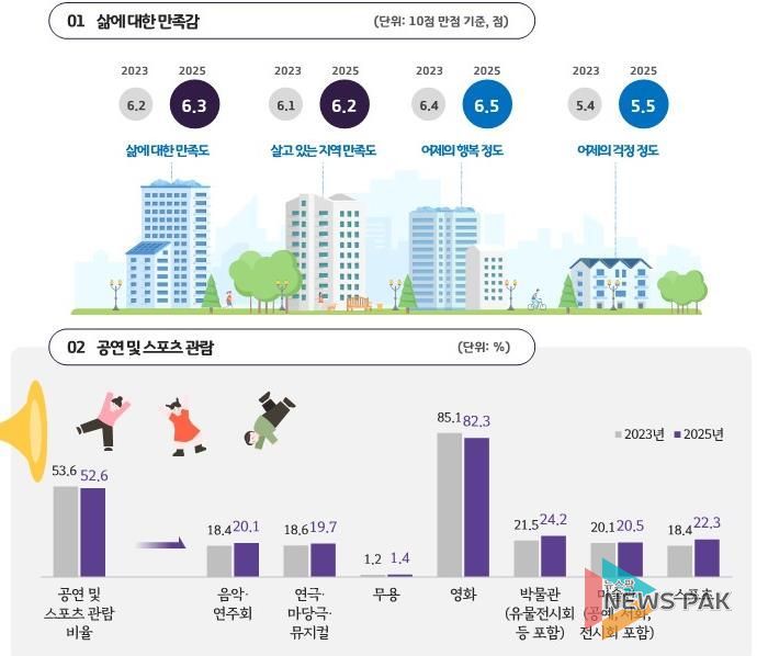 이번 결과는 2021년부터 2025년까지 삶의 만족·행복감, 여가·문화·관광 참여, 생활·안전 인식, 경제 체감 전반에서 완만하지만 일관된 개선 흐름을 보이는 점이 특징이다.