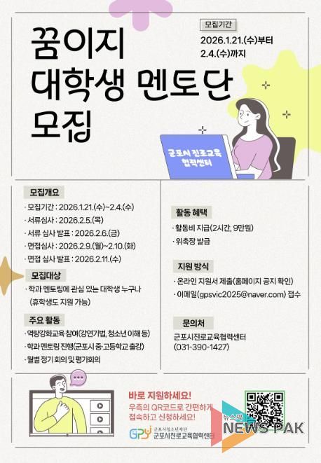 뉴스팍 배상미 기자 | (재)군포시청소년재단 군포시진로교육협력센터는 관내 청소년의 진로 탐색과 진로 역량 강화를 위해 '2026년 군포시진로교육협력센터 교육기부자'를 모집한다고 밝혔다.