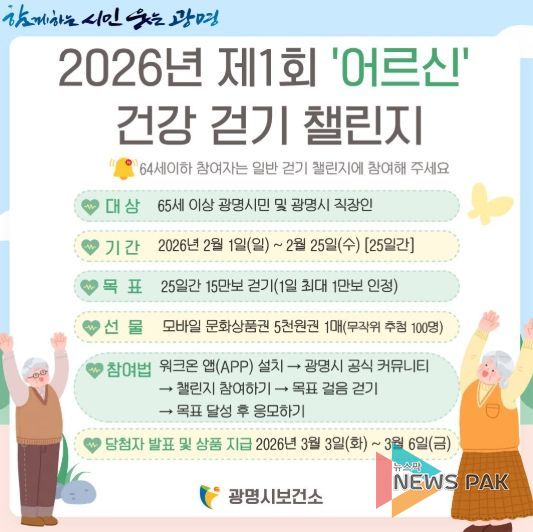 뉴스팍 배상미 기자 | 광명시가 오는 2월부터 모바일 걷기 플랫폼 ‘워크온(WalkOn)’을 활용한 걷기 챌린지 방식을 개편하고, 65세 이상 시민을 위한 ‘어르신 걷기 챌린지’를 별도로 운영한다고 21일 밝혔다.