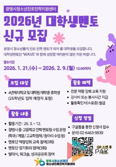 뉴스팍 배상미 기자 | 광명시청소년재단 청소년진로진학지원센터는 관내 중·고등학교 청소년 대상 학과 멘토링 운영을 위해 ‘2026년 대학생 멘토단(wave)’을 모집한다고 밝혔다.