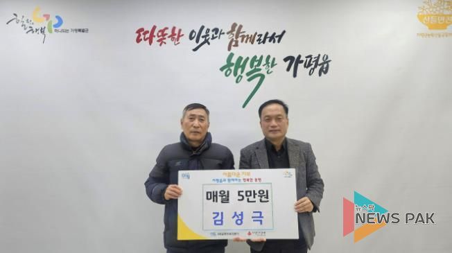 뉴스팍 배상미 기자 | 가평군 가평읍 주민 김성극 씨가 취약계층 이웃돕기 성금으로 매월 5만 원을 가평읍 행정복지센터에 정기기탁하기로 했다.