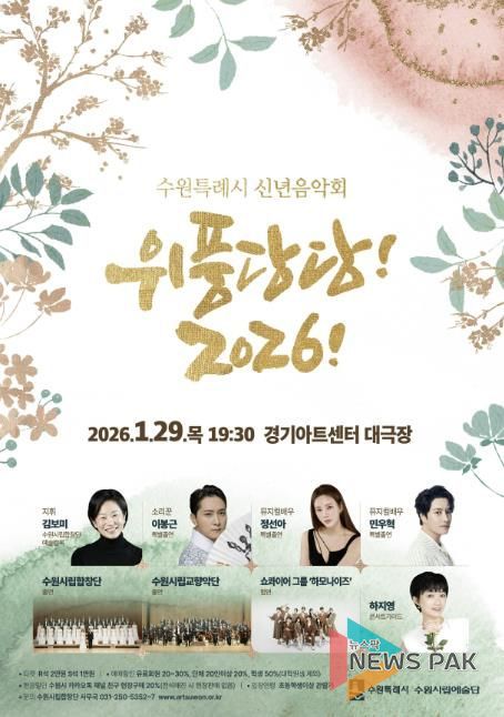 수원시 관계자는 “신년음악회 ‘위풍당당! 2026!’는 장르와 세대를 아우르는 구성으로 수원특례시의 문화적 역량과 예술적 비전을 보여주는 무대”라며 “음악으로 희망과 용기를 전하는 이번 음악회에 많은 시민이 함께해 주시길 바란다”고 말했다.