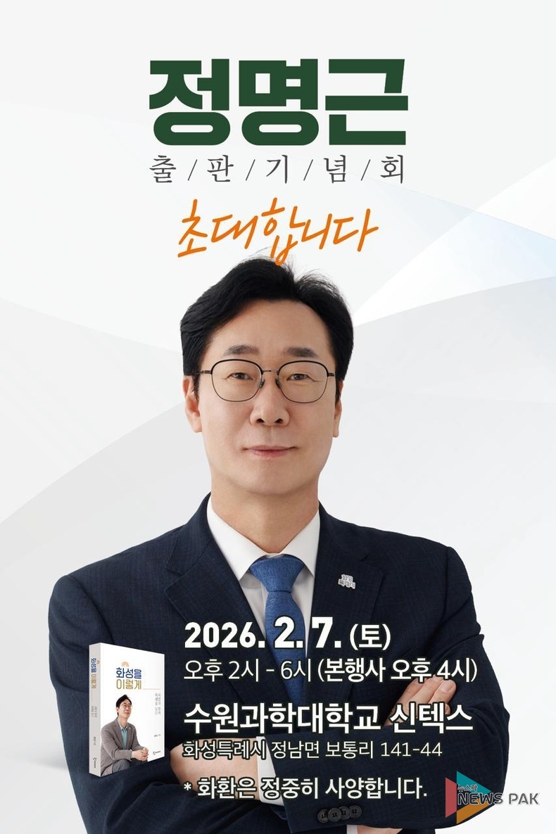 정명근 화성시장은 오는 2월 7일(토) 오후 2시부터 6시까지 화성시 정남면 소재 수원과학대학교 신텍스(SINTEX)에서 저서 「화성을 이렇게 : 시민과 함께 미래를 담다」의 출판기념회를 개최한다. 이날 행사는 오후 2시부터 저자 사인회 등 식전 행사가 시작되며, 오후 4시에 본격적인 본행사가 진행될 예정이다.