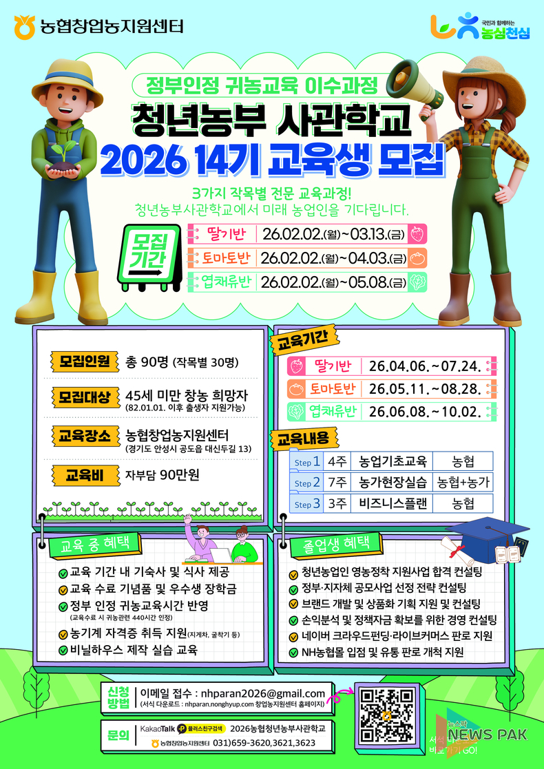 뉴스팍 배상미 기자 | 농협중앙회(회장 강호동)는 미래 농업의 성장동력인 예비 청년농업인 육성을 위해 2일부터 2026년도 농협청년농부사관학교 교육생을 모집한다고 밝혔다.