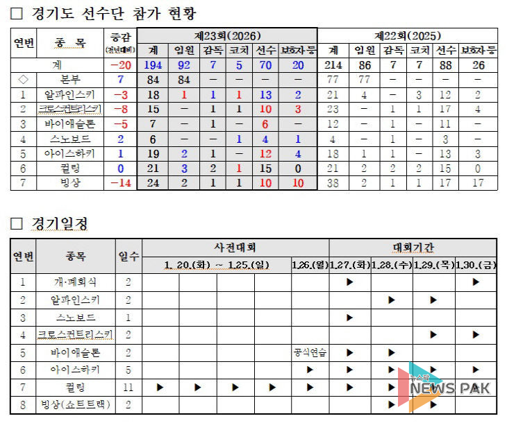 대한장애인체육회가 주최하고 강원특별자치도 일원에서 열리는 이번 대회는 1월 27일부터 30일까지 나흘간의 열전에 돌입한다. 경기도는 지난해 치열한 접전 끝에 종합우승을 차지하며 ‘장애인 체육 웅도’의 자존심을 세운 바 있다.