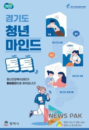 뉴스팍 이소율 기자 | 평택시는 학업과 취업 등 환경적 요인으로 증가하는 청년 정신질환에 미리 개입하고 적절한 치료 서비스를 제공하고자 ‘청년마인드톡톡’ 사업을 운영한다고 밝혔다.