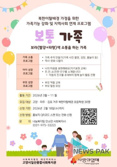 뉴스팍 배상미 기자 | 고양시일산종합사회복지관이 북한이탈배경 가정의 가족기능 강화 및 지역사회 통합 프로그램 ‘보통 가족’의 참여자를 이달 18일까지 모집한다.