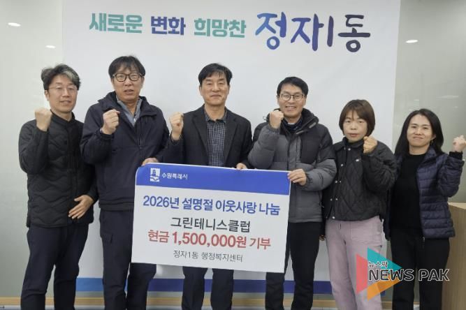 뉴스팍 배상미 기자 | 수원시 장안구 정자1동은 지난 3일, 그린테니스클럽이 설 명절을 맞아 관내 취약계층을 돕기 위한 기부금 150만원을 전달했다고 밝혔다.