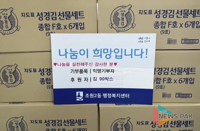 뉴스팍 배상미 기자 | 수원시 장안구 조원2동은 지난 3일, 설 명절을 맞아 익명의 기부자가 김 81박스를 기탁해 지역사회에 따뜻한 온정을 전했다고 밝혔다.