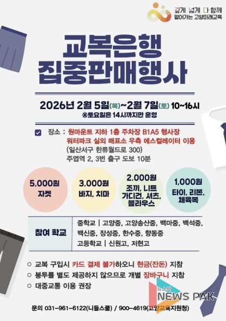 뉴스팍 배상미 기자 | 경기도고양교육지원청은 관내 중·고등학교 졸업생의 교복 물려주기 일환으로 교복은행 집중판매 행사를 2월 5일부터 7일까지 3일간 고양 원마운트에서 진행한다고 밝혔다.