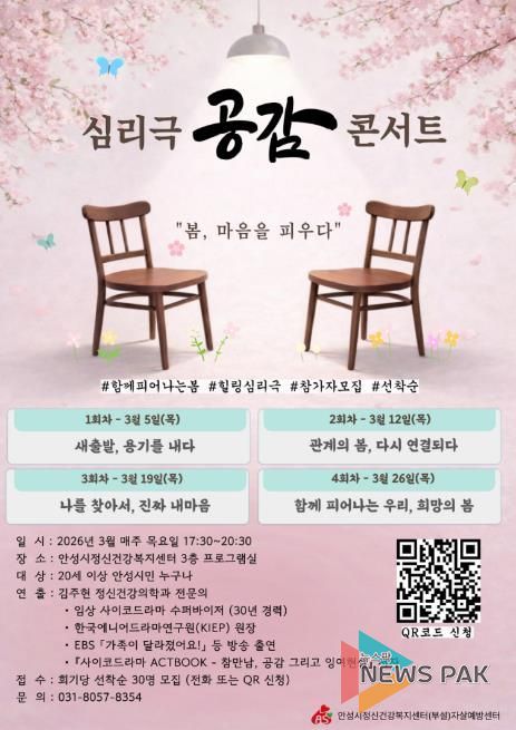 뉴스팍 배상미 기자 | 안성시보건소 안성시정신건강복지센터(부설 자살예방센터)는 시민의 정신건강 증진과 생명존중 문화 조성을 위해 심리극(사이코드라마) 기법을 활용한 체험형 집단 프로그램 '공감' 콘서트를 오는 3월 운영한다고 밝혔다.