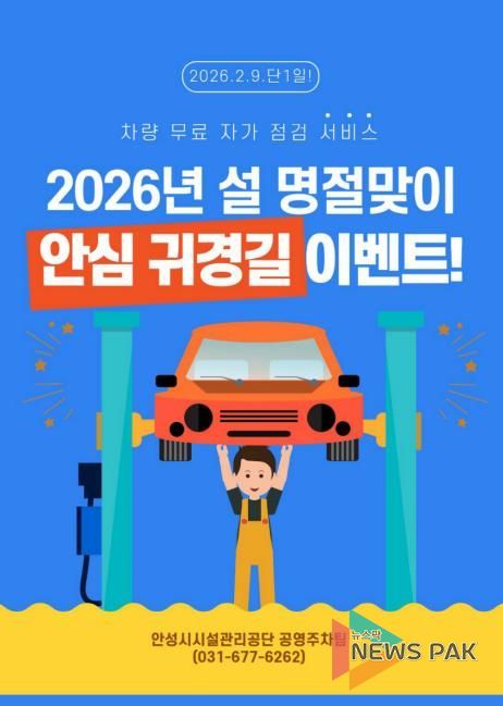 뉴스팍 배상미 기자 | 안성시시설관리공단은 오는 2월 9일 오전 10시부터 아양지구 제2공영주차장(경기도 안성시 옥산동546)에서 2026년 설 명절을 맞이하여 공영주차장 이용객과 지역 주민을 대상으로, 차량 무료 자가 점검 서비스 ‘안심 귀성길’캠페인을 추진한다고 밝혔다.
