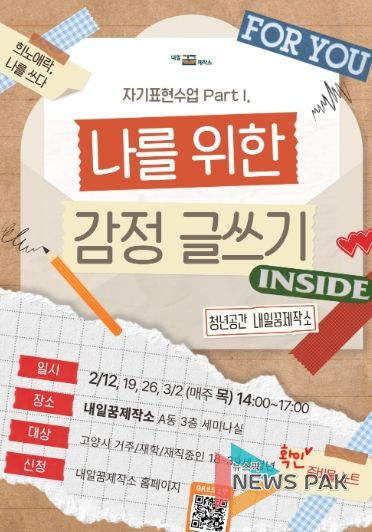 뉴스팍 배상미 기자 | 고양특례시는 오는 2월 12일부터 매주 목요일 4주간, 고양시 청년공간‘내일꿈제작소’에서 관내 청년들의 마음돌봄을 위한‘감정글쓰기’프로그램을 진행한다고 밝혔다.