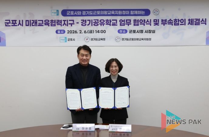 뉴스팍 배상미 기자 | 군포의왕교육지원청과 군포시청은 2월 6일 군포시청에서 '2026 군포시 미래교육협력지구-경기공유학교 업무협약식 및 부속합의서'를 체결했다.