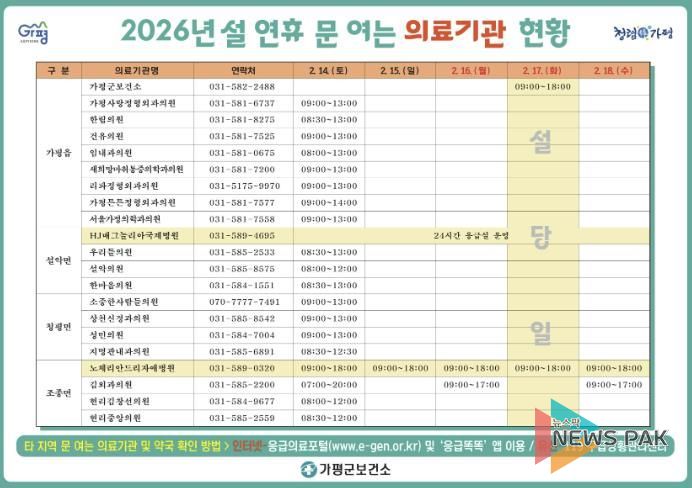 뉴스팍 배상미 기자 | 가평군이 설 연휴 기간 의료 공백 최소화에 나선다. 군은 2월 14일부터 18일까지 이어지는 설 연휴 동안 군민 의료 불편을 최소화하기 위해 응급진료상황실을 설치·운영한다고 밝혔다.