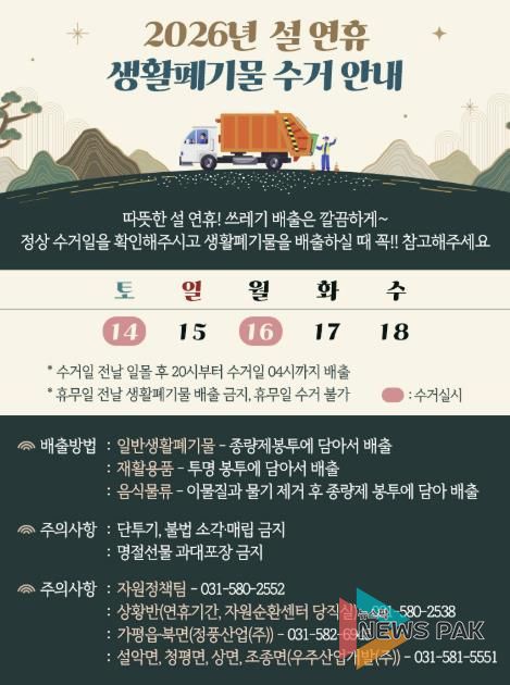 뉴스팍 배상미 기자 | 가평군은 설 명절을 맞아 군민과 방문객 모두가 쾌적한 환경에서 청결한 연휴를 보낼 수 있도록 생활폐기물 처리 대책을 마련했다.
