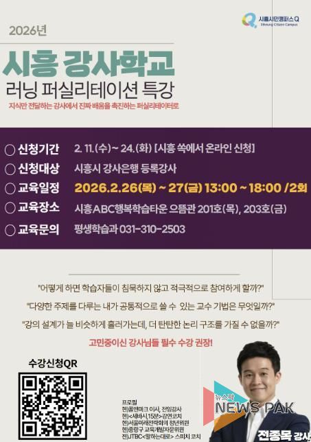 뉴스팍 배상미 기자 | 시흥시는 오는 2월 26일부터 27일까지 이틀간 시흥ABC행복학습타운에서 강사들의 교수법 혁신을 위한 ‘2026년 시흥 강사학교: 러닝 퍼실리테이션 특강’을 운영한다.