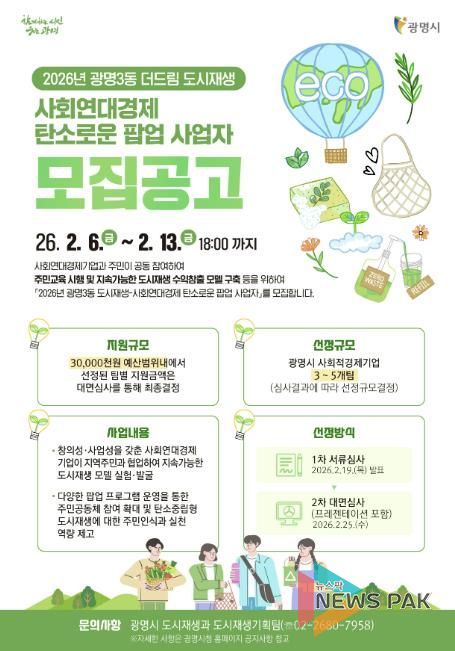 시는 오는 3월부터 12월까지 광명3동 더드림 도시재생사업의 일환인 ‘2026년 광명3동 도시재생-사회연대경제 탄소로운 팝업 사업’을 추진한다고 10일 밝혔다.