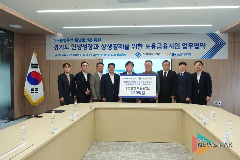 이날 농협은행 경기본부는 경기신용보증재단과‘2026년 경기도 민생성장과 상생경제를 위한 포용금융지원 업무협약’을 체결하고 도내 중소기업과 소상공인을 위해 1,800억원 규모의 대출을 지원할 예정이다.