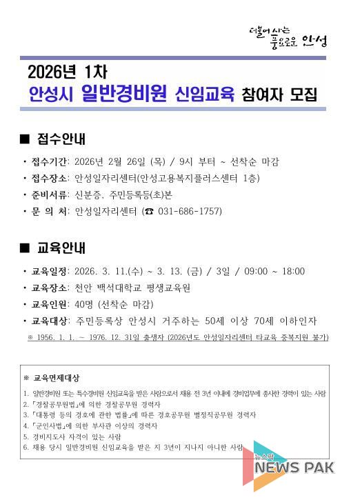 뉴스팍 배상미 기자 | 안성시는 관내 구직자의 안정적인 일자리 창출을 위해 오는 2월 26일부터 '2026년 제1차 안성시 일반경비원 신임 교육' 교육생을 모집한다고 밝혔다.