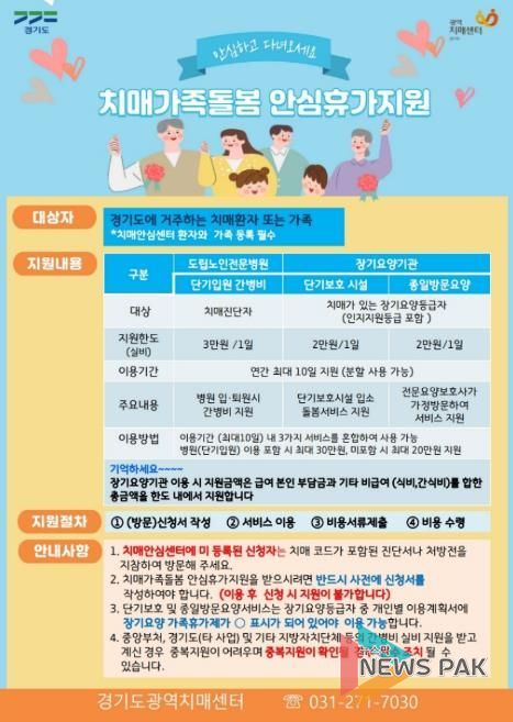 뉴스팍 이소율 기자 | 평택시 치매안심센터는 치매 가족의 돌봄 부담을 완화하고 정서적 재충전의 기회를 제공하기 위해 '경기도 치매가족돌봄 안심휴가 지원사업'을 운영한다고 밝혔다.
