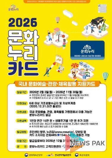한편, 문화누리카드 지원 대상은 6세 이상 기초생활수급자와 차상위계층으로, 올해는 지난해보다 1만 원 인상된 15만 원으로 지원금이 확대됐다. 또한, 청소년기(13~18세)와 준고령기(60~64세) 대상자에게는 1만 원이 추가 지급된다.