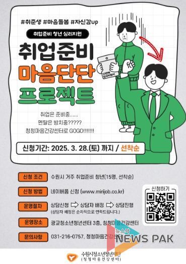 뉴스팍 배상미 기자 | 수원시청소년청년재단(이사장 최종진) 청청마음건강센터는 취업 준비로 인한 심리적 압박감과 경제적 부담을 동시에 겪는 청년들을 위해 2026. 취업준비 청년 심리지원'취업준비 마음단단 프로젝트'참여자를 모집한다고 밝혔다.