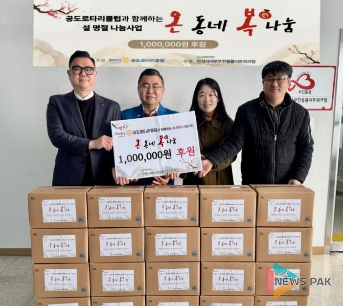 뉴스팍 배상미 기자 | 사회복지법인 한길복지재단이 수탁 운영하는 안성시서부무한돌봄네트워크팀은 국제로타리 3600지구 공도로타리클럽과 지난 12일 설 명절 나눔사업 ‘온동네 복나눔’ 후원금 100만 원 전달식을 가졌다.