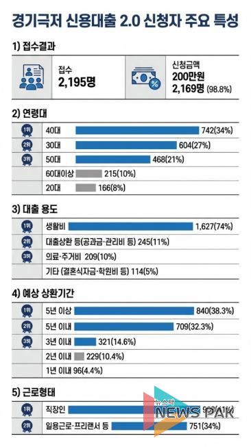 경기도는 지난 2월 11일 마감한 ‘경기 극저신용대출 2.0’ 신청자 2,195명을 분석한 결과 신청자의 74%(1,627명)가 대출 용도를 ‘생활비’라고 밝히는 등 금융취약계층의 생계유지와 채무 부담 해소를 위해 금융 지원이 절실한 것으로 나타났다고 20일 밝혔다.