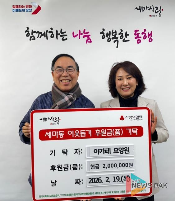 뉴스팍 이소율 기자 | 오산시 세마동 행정복지센터는 지난 19일 오산시 외삼미동에 소재한 아가페 요양원으로부터 지역 내 취약계층 지원을 위한 성금 200만 원을 기탁받았다고 밝혔다.