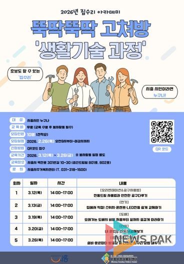 뉴스팍 배상미 기자 | 시흥시주거복지센터는 시민이 직접 집 관리와 수리 방법을 익혀 스스로 주거 환경을 개선할 수 있도록 2026년 집수리 아카데미 ‘뚝딱뚝딱 고쳐방’ 생활기술 과정 교육생을 10명 모집한다.