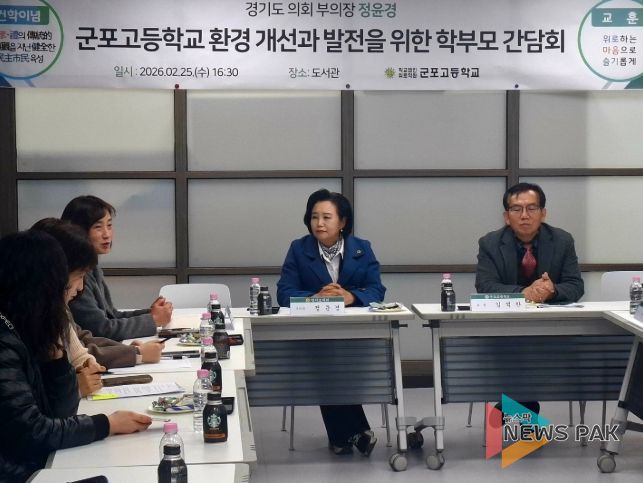 뉴스팍 배상미 기자 | 경기도의회 정윤경 부의장(더불어민주당, 군포1)은 2월 25일 군포고등학교 도서관에서 교직원 및 학부모들과 ‘학교 환경 개선과 발전을 위한 학부모 간담회’를 개최하고 학교 현안 전반에 대해 의견을 나눴다.