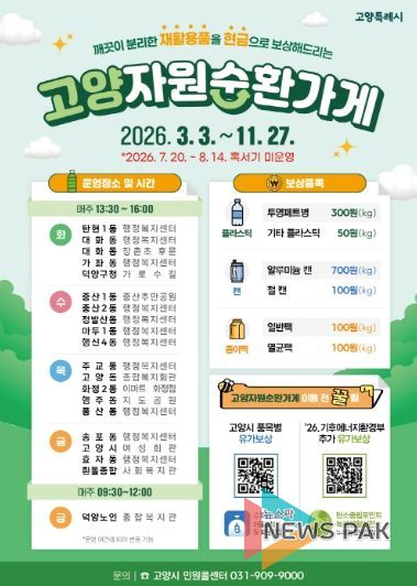 뉴스팍 배상미 기자 | 고양특례시는 시민들의 올바른 분리배출 실천을 유도하고 고품질 재활용 문화 확산을 위해 자원순환가게 운영을 오는 3월 3일부터 시작한다고 밝혔다.