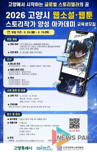 뉴스팍 배상미 기자 | 고양산업진흥원이 웹콘텐츠 산업을 이끌어갈 스토리 전문 인재 발굴을 위한 ‘2026 고양시 웹소설·웹툰 스토리작가 양성 아카데미’ 교육생을 모집한다.