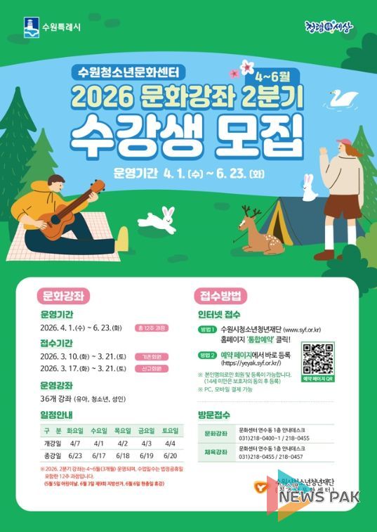 뉴스팍 배상미 기자 | 수원시청소년청년재단(이사장 최종진) 수원청소년문화센터가 오는 4월부터 시작되는 ‘2026년 2분기 문화강좌’ 수강생을 모집하며, 시민들의 일상을 풍요로운 배움으로 채울 준비를 마쳤다.