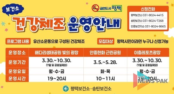 한편, 평택시는 지역별 균형 있는 건강 서비스를 위해 서부지역 시민을 위한 ‘아침 건강체조’도 병행한다. 서부지역 프로그램은 3월 5일부터 현화근린공원에서 매주 화·목요일 오전 10시에 진행된다.
