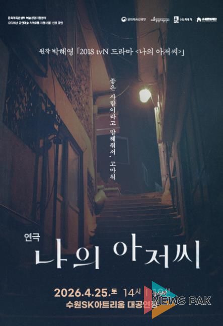 뉴스팍 배상미 기자 | 수원문화재단 수원SK아트리움은 오는 4월 25일, 수많은 시청자의 인생 드라마로 손꼽히는 tvN 드라마 원작의 연극 ‘나의 아저씨’를 대공연장 무대에 올린다고 밝혔다.
