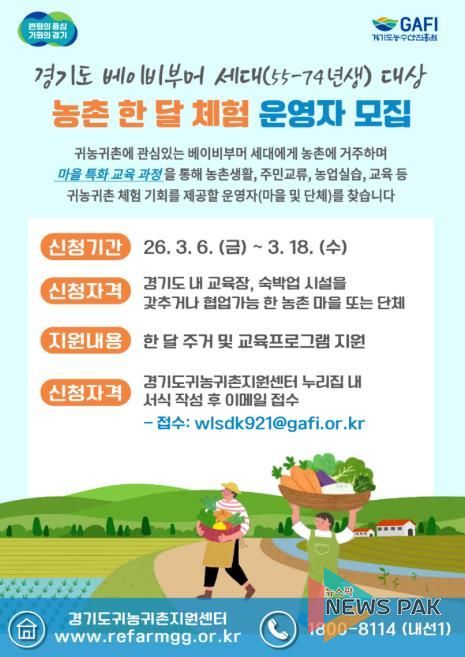 뉴스팍 배상미 기자 | 경기도와 경기도농수산진흥원은 ‘경기도 베이비부머 농촌 한 달 체험’을 운영할 마을·단체 2곳을 오는 18일까지 모집한다.