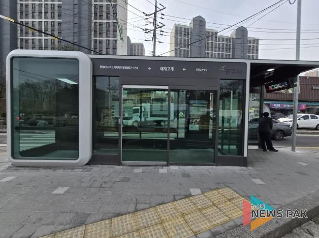 뉴스팍 이화형 기자 | 광주시는 신현동에 위치한 노후 버스정류장 2곳(태재고개, 현대모닝사이드1차아파트)을 스마트형 버스정류장으로 교체 설치해 대중교통 이용객의 안전을 강화하고 이용 편의를 개선했다고 6일 밝혔다.
