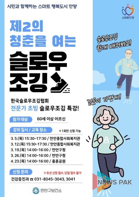 뉴스팍 배상미 기자 | 안양시 만안구보건소는 어르신 노쇠의 주요 원인인 근감소증 예방을 위하여 일상에서 안전하게 꾸준히 실천할 수 있는 노쇠예방 운동프로그램 ‘슬로우조깅’을 선제적으로 보급한다고 6일 밝혔다.
