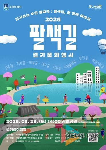 뉴스팍 배상미 기자 | 수원특례시가 ‘2026 팔색길 걷기 문화행사’에 참여할 시민 400명을 3월 20일까지 선착순으로 모집한다.