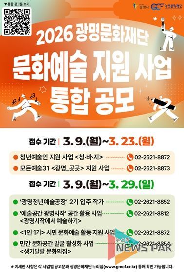 뉴스팍 배상미 기자 | 광명문화재단은 지역 예술인(단체)의 안정적인 창작 환경을 조성하고 참여 기회를 확대·보장하기 위해 ‘2026년 문화예술지원 공모’ 6개 부문을 통합 시행한다고 밝혔다.
